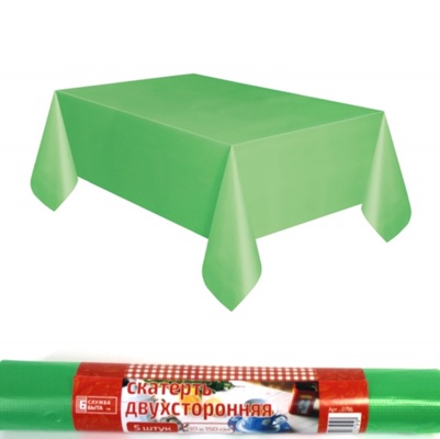 Скатерть одноразовая в рулоне. Изготовлена из полиэтилена, размер 110*180см, в рулоне 5 штук (разделяются по перфорации), плотность 35мкм. Станет отличным украшением для праздничного стола на любом мероприятии.