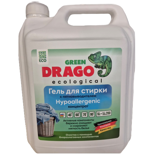 Гель для стирки Green Drago объёмом 5 литров в концентрации для цветного белья предназначен для стирки и замачивания изделий из хлопчатобумажных, льняных, синтетических и смешанных тканей в стиральных машинах любого типа и ручной стирки в воде любой жёсткости.