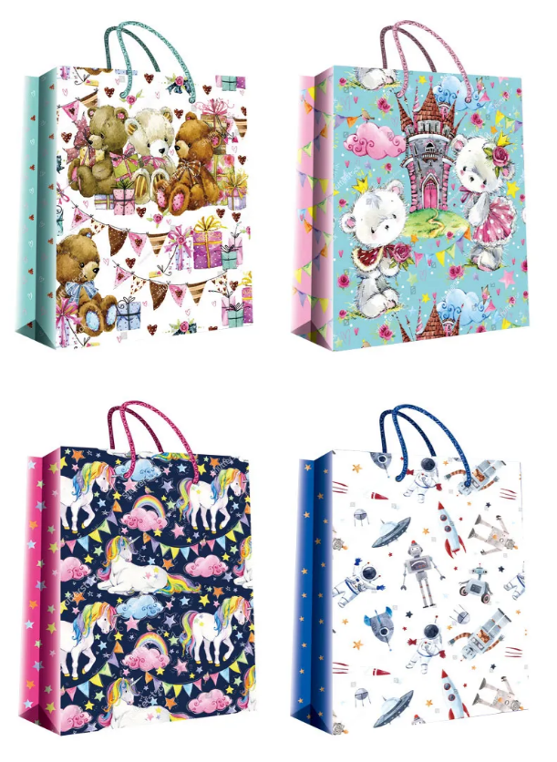 Сумка бумажная подарочная, размер 32*26,5*14,5см. В упаковке 4 цвета микс.