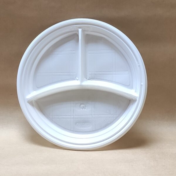Тарелка пластиковая одноразовая 205 мм, 3-х секционная,, изготовлена из полистирола. Предназначена для холодных пищевых продуктов. Широко применяется в сфере быстрого питания, на выездных мероприятиях. Продается упаковкой 100 штук.
