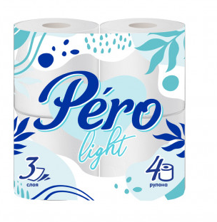 Туалетная бумага "Pero Light " белая трехслойная с перфорацией и тиснением.Обеспечивает мягкость, впитываемость и прочность. Состав: 100% целлюлоза. В упаковке 4 рулона.