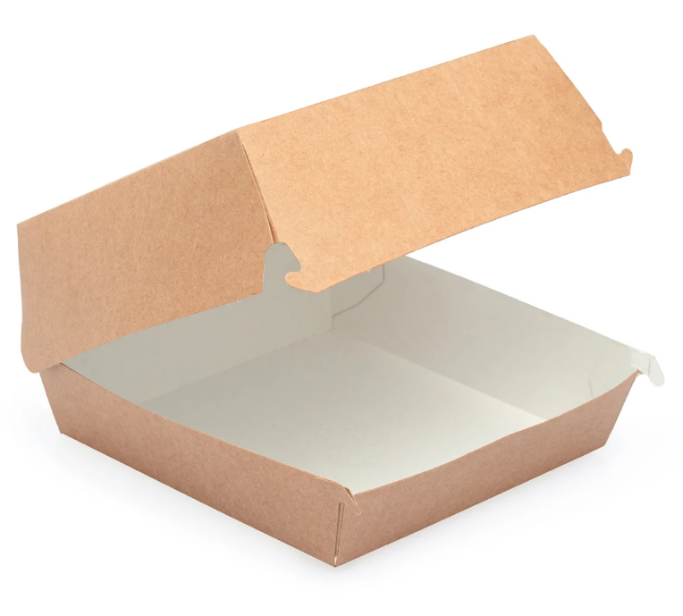 Упаковка Крафт для гамбургера. Размер 140*140*70мм. Надежная влагоустойчивая упаковка используется для горячей или холодной пищи на вынос, для кондитерских изделий, салатов, закусок.