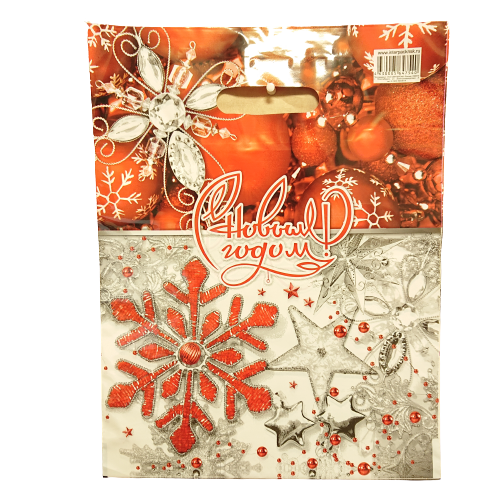 Новогодний пакет с вырубной ручкой, размер 38*45+5см служит для упаковки небольших подарков, предметов одежды, продуктов.