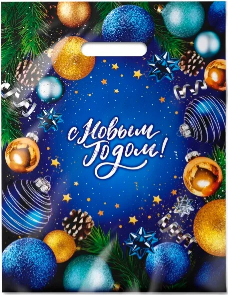 Новогодний пакет с вырубной ручкой, размер 40*47см, плотность 45мк. Пакет служит для упаковки косметических средств, подарков, игрушек. Продается по 50 штук.