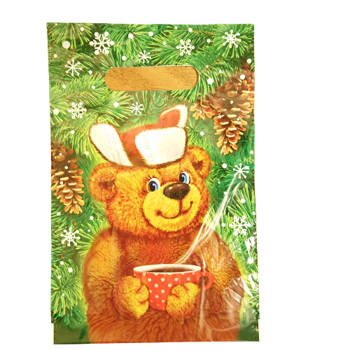 Новогодний пакет с вырубной ручкой, размер 38*45+5см служит для упаковки небольших подарков, предметов одежды, продуктов.