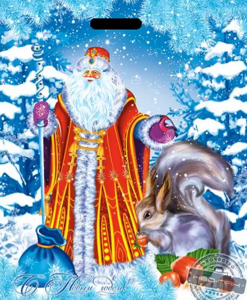 Новогодний пакет с вырубной ручкой, размер 40*47см, плотность 45мк. Пакет служит для упаковки косметических средств, подарков, игрушек. Продается по 50 штук.